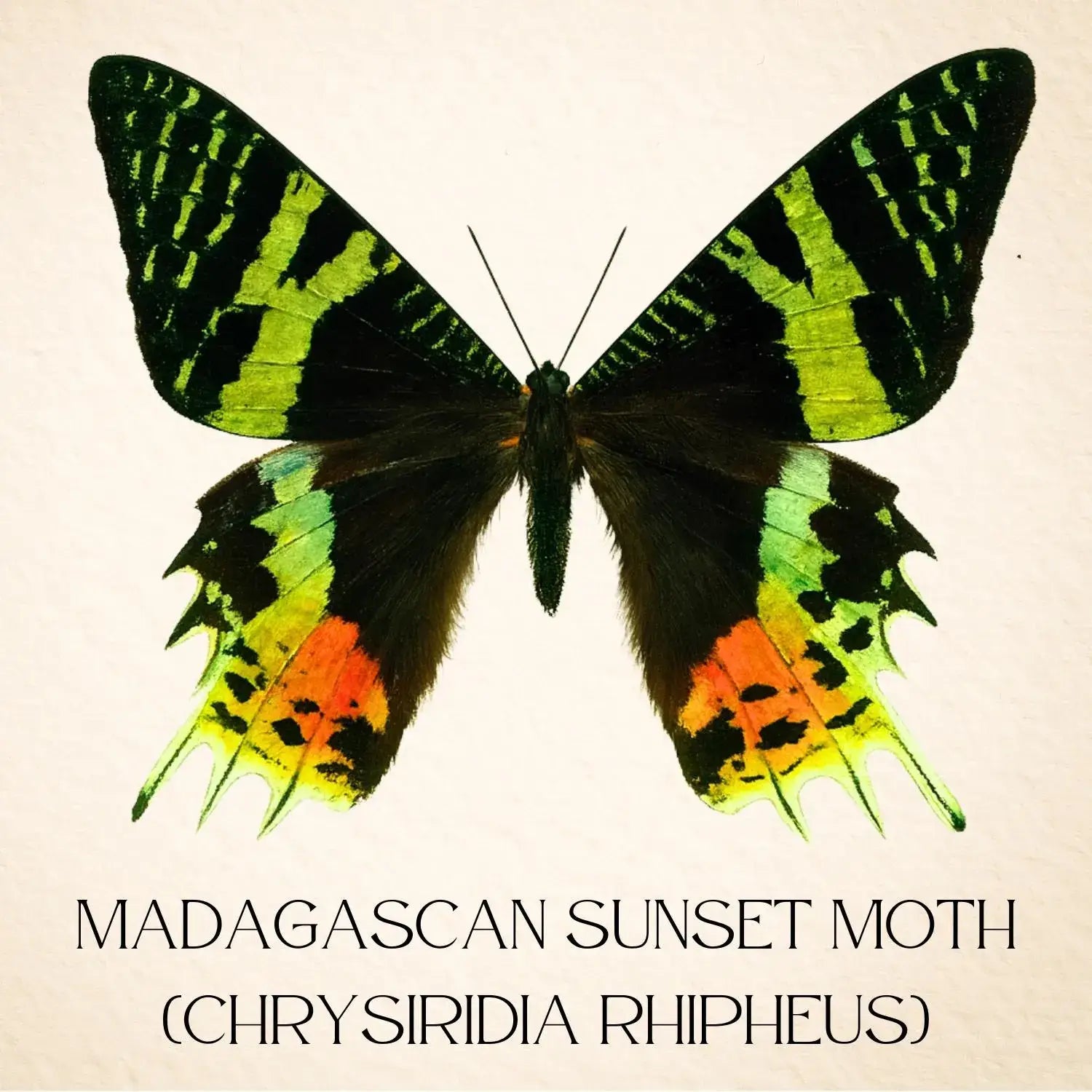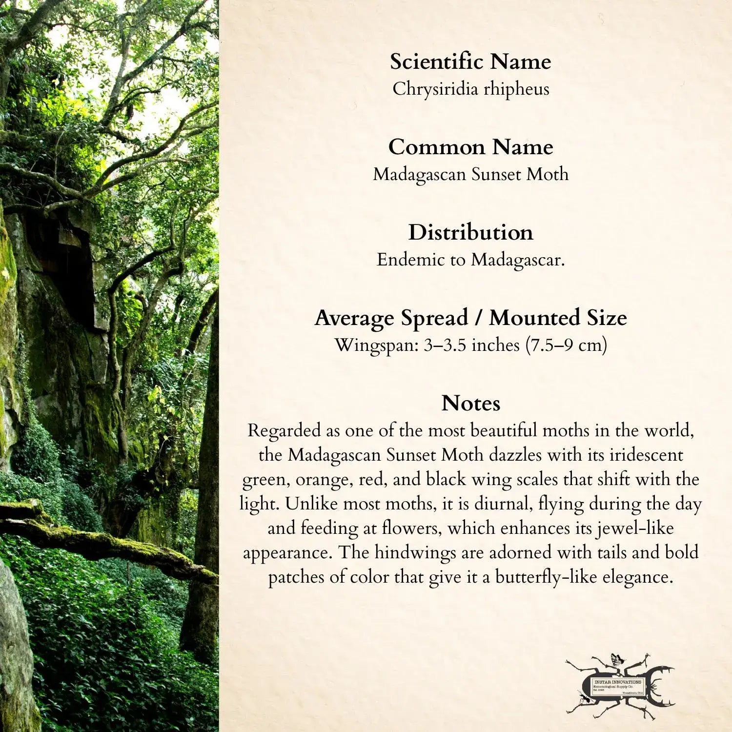 A real Madagascan Sunset Moth (Chrysiridia rhipheus) displayed in a 6x6x2 shadowbox frame. Considered one of the most beautiful moths in the world, this species is admired for its vivid iridescent green, orange, and purple coloration. Each specimen is professionally mounted and preserved, ready to sell in shops or display in collections.